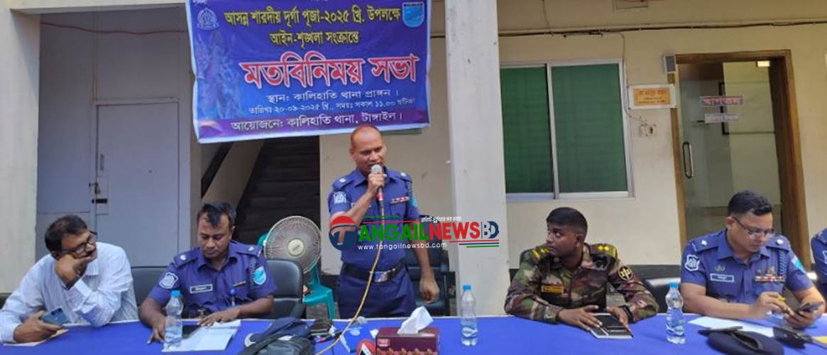 স্টাফ রিপোর্টার ॥ টাঙ্গাইলের কালিহাতীতে আসন্ন শারদীয় দুর্গাপূজা-২০২৫ উপলক্ষে আইন-শৃঙ্খলা সংক্রান্ত মতবিনিময় সভা অনুষ্ঠিত হয়েছে।শনিবার (২০ সেপ্টেম্বর) সকাল ১১টায় কালিহাতী থানার উদ্যোগে থানা প্রাঙ্গণে এ সভার আয়োজন করা হয়।