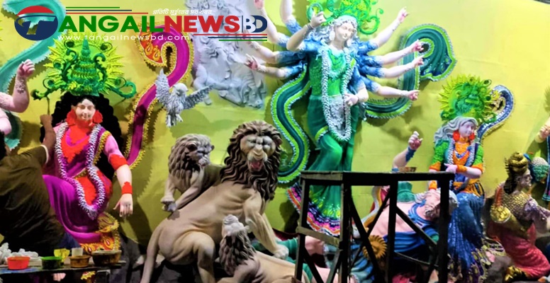 টাঙ্গাইলে প্রতীমায় রঙ-তুলি ও মন্ডপে সাজ-সজ্জায় ব্যস্ত শিল্পীরা
