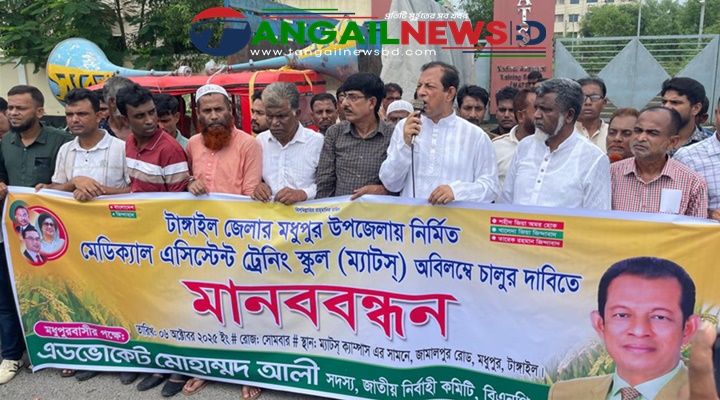 টাঙ্গাইলের মধুপুরে ৩৪ কোটি টাকা ব্যয়ে নির্মিত মেডিকেল এসিসট্যান্ট ট্রেনিং স্কুল (ম্যাটস) চালুর দাবিতে মানববন্ধন ও স্মারকলিপি প্রদান করেছে বিএনপির কেন্দ্রীয় জাতীয় নির্বাহী কমিটির সদস্য এডভোকেট মোহাম্মদ আলীর নেতৃত্বে দলের একাংশের নেতাকর্মী ও এলাকাবাসী। সোমবার (৬ অক্টোবর) দুপুরে মধুপুর উপজেলার কাইতকাই এলাকায় জামালপুর-টাঙ্গাইল আঞ্চলিক মহাসড়কের পাশে মেডিক্যাল এসিসট্যান্ট ট্রেনিং স্কুল (ম্যাটস) এর সামনে মধুপুরবাসীর পক্ষে অ্যাডভোকেট মোহাম্মদ আলী এই মানববন্ধনের আয়োজন করে। চার বছর আগে নির্মিত এই প্রতিষ্ঠান চালুর দাবিতে অনুষ্ঠিত মানববন্ধনে বিভিন্ন শ্রেণিপেশার লোক অংশ নেয়।