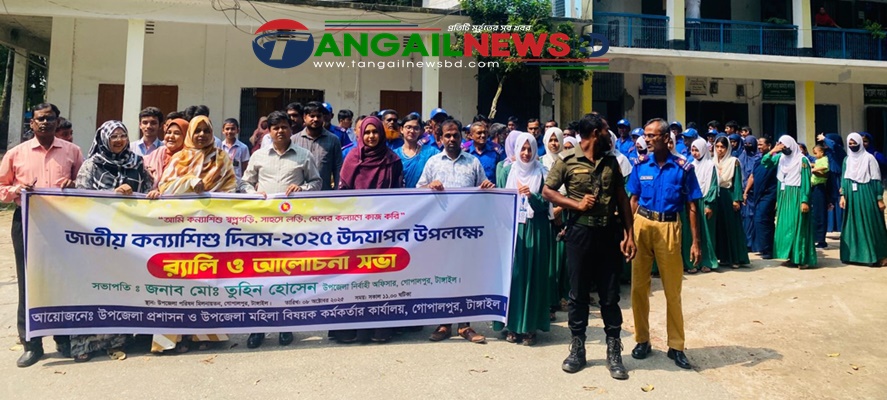 “আমি কন্যা শিশু স্বপ্ন গড়ি, সাহসে লড়ি, দেশের কল্যাণে কাজ করি” এই প্রতিপাদ্যকে সামনে রেখে টাঙ্গাইলের গোপালপুরে জাতীয় কন্যাশিশু দিবস উদযাপন করা হয়েছে। বুধবার (৮ অক্টোবর) সকালে গোপালপুর উপজেলা প্রশাসন ও মহিলা বিষয়ক কর্মকর্তার কার্যালয়ের উদ্যোগে একটি বর্ণাঢ্য র‌্যালি বের করা হয়। র‌্যালিটি উপজেলা চত্বর প্রদক্ষিণ করে উপজেলা পরিষদ মিলনায়তনে এসে আলোচনা সভায় মিলিত হয়।
