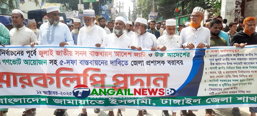 জাতীয় সংসদ নির্বাচনের পূর্বে জুলাই জাতীয় সনদ বাস্তবায়ন আদেশ জারী ও উক্ত আদেশের উপর গণভোট আয়োজন সহ পাঁচ দফা বাস্তবায়নের দাবিতে টাঙ্গাইল জেলা জামায়াতে ইসলামীর উদ্যোগে জেলা প্রশাসক বরাবর স্মারকলিপি প্রদান করা হয়েছে। রোববার (১২ অক্টোবার) সকালে মিছিল সহকারে  জামায়াতে ইসলামীর নেতা-কর্মীরা জেলা প্রশাসকের কার্যালয়ে গেয়ে পৌছান। পরে টাঙ্গাইল-৫ (সদর) আসনে বাংলাদেশ জামায়াতে ইসলামী মনোনীত এমপি প্রার্থী ও জেলা আমীর আহসান হাবিব মাসুদসহ অন্যান্য নেতৃবৃন্দ স্মারকলিপি হস্তান্তর করেন। স্মারকলিপি গ্রহন করেন জেলা প্রশাসক শরীফা হক।