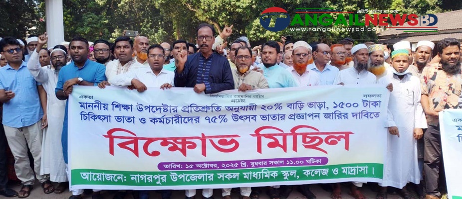শিক্ষা উপদেষ্টার প্রতিশ্রুতি অনুযায়ী এমপিওভুক্ত শিক্ষকদের ভাতার প্রজ্ঞাপন জারির দাবিতে শিক্ষক-কর্মচারীদের শান্তিপূর্ণ অবস্থান কর্মসূচিতে হামলার প্রতিবাদে টাঙ্গাইলের নাগরপুর উপজেলায় বিক্ষোভ মিছিল অনুষ্ঠিত হয়েছে। বুধবার (১৫ অক্টোবর) সকালে নাগরপুর উপজেলার সকল মাধ্যমিক স্কুল, কলেজ ও মাদ্রাসা বিক্ষোভ কর্মসূচির আয়োজন করে।