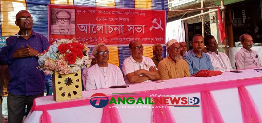 টাঙ্গাইলের গোপালপুরে কৃষক নেতা ও স্বাধীনতা সংগ্রামের কিংবদন্তি ব্যক্তিত্ব হাতেম আলী খানের ৪৮তম মৃত্যুবার্ষিকী উপলক্ষে আলোচনা সভা ও দোয়া মাহফিল অনুষ্ঠিত হয়েছে। বাংলাদেশ কমিউনিস্ট পার্টি (সিপিবি) গোপালপুর উপজেলা শাখার আয়োজনে শুক্রবার (২৪ অক্টোবর) বিকেলে গোপালপুর থানা ব্রীজ চত্বরে এ অনুষ্ঠান অনুষ্ঠিত হয়। এতে সভাপতিত্ব করেন বীর মুক্তিযোদ্ধা কমরেড আশরাফ তালুকদার।