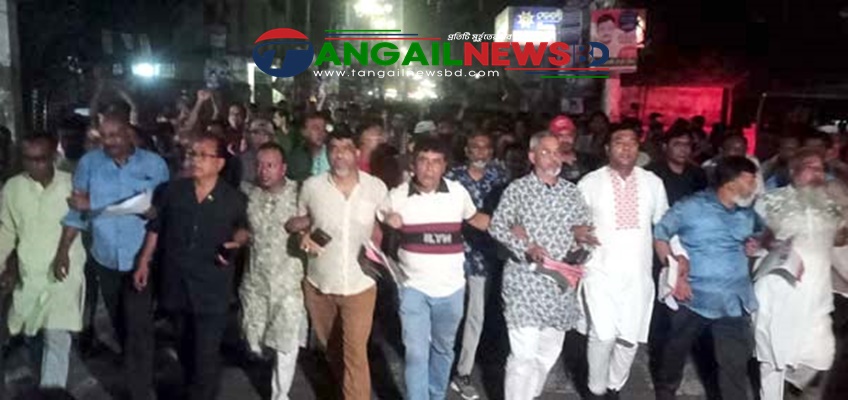 রোববার (২৬ অক্টোবর) সন্ধ্যায় সদর উপজেলার বিভিন্ন স্থান থেকে খন্ড খন্ড মিছিল শহরের শহীদ স্মৃতি পৌর উদ্যানে এসে জড়ো হয়। পরে সেখান থেকে গণমিছিল শুরু করে শহরের বিভিন্ন সড়ক প্রদক্ষিন করে টাঙ্গাইল প্রেসক্লাবে এসে সংক্ষিপ্ত পথসভার মধ্যে দিয়ে শেষ হয়।