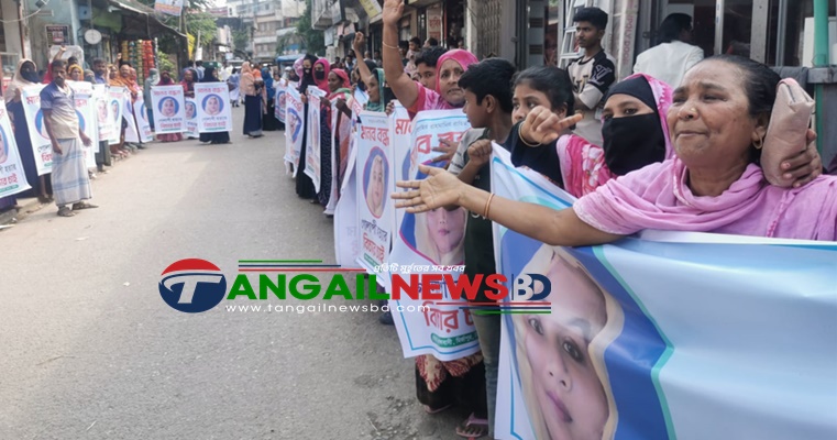 টাঙ্গাইলের মির্জাপুরে তিন সন্তানের জননী গোলাপী হত্যাকারীদের চিহ্নিত করে গ্রেপ্তার ও বিচারের দাবিতে মানববন্ধন করা হয়েছে। রবিবার (১৬ নভেম্বর) সকালে মির্জাপুর প্রেসক্লাবের সামনে ঘন্টাব্যাপী মানববন্ধনের আয়োজন করেন নিহতের বাবা-মা-স্বজন ও এলাকাবাসীরা। মানববন্ধনে শতাধিক নারী-পুরুষ ব্যানার ও ফেস্টুন হাতে শ্লোগান দিতে থাকেন। মানববন্ধনে নিহত গোলাপী বেগমের মা সমলা বেগম বাবা বিশু মিয়া, গোলাপীর তিন মেয়ে কহনা (১৪) কাফিয়া (৫) ও পাঁচ মাসের শিশু কাশমিয়া অংশ নেয়।