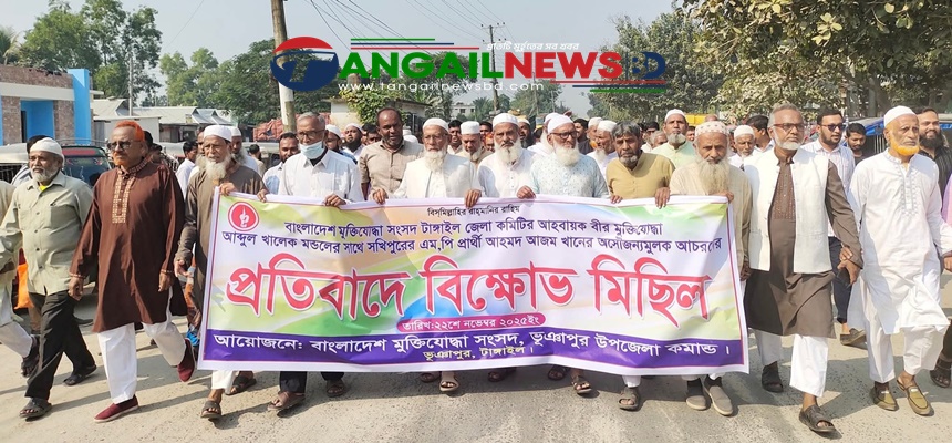 বাংলাদেশ মুক্তিযোদ্ধা সংসদ টাঙ্গাইল জেলা ইউনিট কমান্ডের আহ্বায়ক বীর মুক্তিযোদ্ধা এডভোকেট আব্দুল খালেক মন্ডলের সাথে কেন্দ্রীয় বিএনপির ভাইস চেয়ারম্যান, টাঙ্গাইল-৮ (বাসাইল-সখীপুর) আসনে বিএনপির মনোনীত এমপি প্রার্থী আহমেদ আজম খানের অসৌজন্যমূলক আচরণের প্রতিবাদে বিক্ষোভ মিছিল ও সমাবেশ করেছেন বীর মুক্তিযোদ্ধারা। শনিবার (২২ নভেম্বর) সকালে বাংলাদেশ মুক্তিযোদ্ধা সংসদ ভূঞাপুর উপজেলা কমান্ডের উদ্যোগে বিক্ষোভ মিছিল ও সমাবেশ অনুষ্ঠিত হয়। মিছিলটি ভূঞাপুর মুক্তিযোদ্ধা সংসদের সামনে থেকে বের হয়ে পৌর শহরের বিভিন্ন সড়ক প্রদক্ষিণ শেষে উপজেলা চত্বরে এক সমাবেশ অনুষ্ঠিত হয়।
