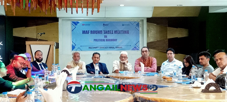 ডেমোক্রেসি ইন্টারন্যাশনাল মাল্টিপাটি এডভোকেসি ফোরামের (এমএএফ) উদ্যোগে টাঙ্গাইলে রাজনৈতিক সম্প্রীতি উন্নয়নে করণীয় বিষয় নিয়ে গোল টেবিল মতবিনিময় সভা অনুষ্ঠিত হয়েছে। বুধবার (২৬ নভেম্বর) দুপুরে শহরের একটি রেষ্টুরেন্টে মতবিনিময় সভার আয়োজন করা হয়। আসন্ন জাতীয় সংসদ নির্বাচনে নাগরিক সমাজের প্রত্যাশা ও চ্যালেঞ্জ বিবেচনায় রাজনৈতিক নেতৃবৃন্দের করণীয় বিষয়ে আলোচনা অনুষ্ঠিত হয়।