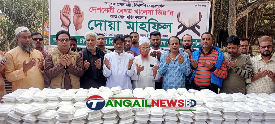 বিএনপির চেয়ারপার্সন সাবেক প্রধানমন্ত্রী বেগম খালেদা জিয়ার আশু রোগ মুক্তি কামনায় টাঙ্গাইলে দোয়া মাহফিল এবং রান্না করা খাবার বিতরণ করা হয়েছে। বুধবার (৩ ডিসেম্বর) বাদ জোহর টাঙ্গাইল শহরের ১৬নং ওয়ার্ডে বিএনপি, যুবদল, ছাত্রদল এবং অঙ্গ ও সহযোগী সংগঠনের উদ্যোগে দোয়া মাহফিলের আয়োজন করা হয়।