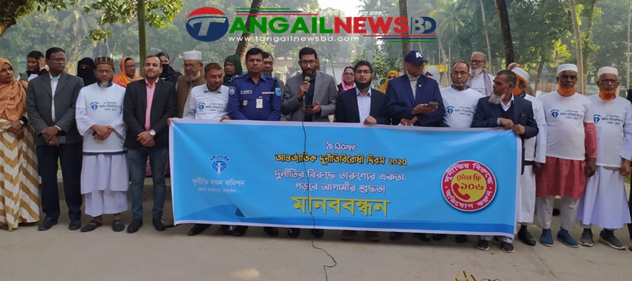 “দুর্নীতির বিরুদ্ধে তারুণ্যের ঐক্য, গড়বে আগামীর শুদ্ধতা”এই প্রতিপাদ্যকে সামনে রেখে টাঙ্গাইলের গোপালপুরে আন্তর্জাতিক দুর্নীতি বিরোধী দিবস উপলক্ষে মানববন্ধন, র‍্যালি ও আলোচনা সভা অনুষ্ঠিত হয়েছে। সোমবার (৯ ডিসেম্বর) সকালে গোপালপুর উপজেলা দুর্নীতি বিরোধী কমিশনের আয়োজনে উপজেলা চত্বরে মানববন্ধন ও পরে উপজেলা হলরুমে আলোচনা সভা অনুষ্ঠিত হয়। গোপালপুর উপজেলা দুর্নীতি প্রতিরোধ কমিটির সভাপতি হারুনুর রশিদের সভাপতিত্বে প্রধান অতিথি ছিলেন ভারপ্রাপ্ত উপজেলা নির্বাহী অফিসার ও উপজেলা সহকারী কমিশনার (ভূমি) নবাব আলী।