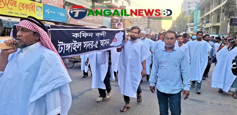 টাঙ্গাইল-৫ (সদর) আসনে বিএনপি প্রার্থী কেন্দ্রীয় বিএনপির প্রচার সম্পাদক সুলতান সালাউদ্দিন টুকুর মনোনয়ন বাতিলের দাবিতে কাফনের কাপড় পরে কফিন মিছিল হয়েছে। বৃহস্পতিবার (১১ ডিসেম্বর) বিকালে টাঙ্গাইল শহরের শান্তিকুঞ্জ মোড় থেকে কফিন মিছিলটি বের হয়ে বিভিন্ন সড়ক প্রদক্ষিণ করে প্রেসক্লাবের সামনে এসে সংক্ষিপ্ত সমাবেশ করে। এ সময় বিএনপির নেতাকর্মীরা কাফনের কাপড় পড়ে মিছিলে অংশ নিয়ে কফিন বহন করে।