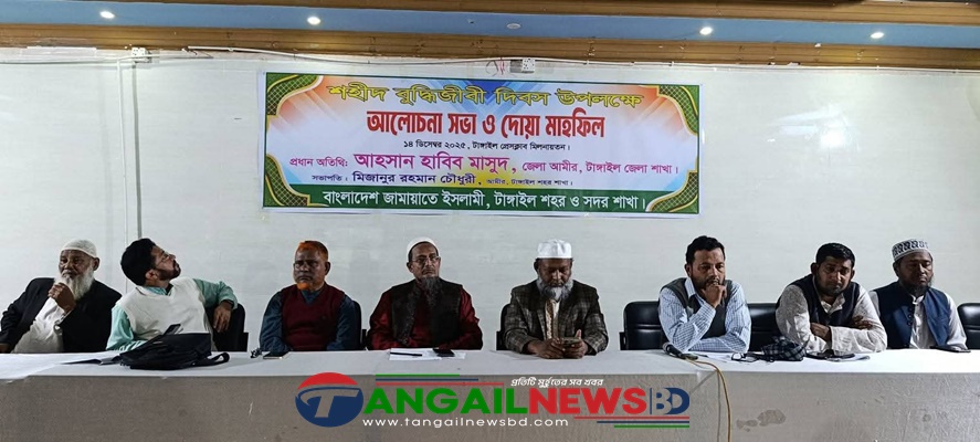 টাঙ্গাইলে জামায়াতে ইসলামীর উদ্যোগে শহীদ বুদ্ধিজীবী দিবস পালন করা হয়েছে। রোববার (১৪ ডিসেম্বর) সকালে টাঙ্গাইল প্রেসক্লাব মিলনায়তনে টাঙ্গাইল সদর উপজেলা ও শহর জামায়াতে ইসলামীর আয়োজনে আলোচনা সভা ও দোয়া মাহফিল অনুষ্ঠিত হয়।