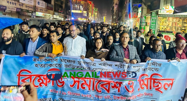 ইনকিলাব মঞ্চের মুখপাত্র শহীদ শরীফ ওসমান হাদির হত্যাকারীদের গ্রেপ্তার ও বিচার দাবিতে টাঙ্গাইলে জুলাই অভ্যুত্থানপন্থী গণতান্ত্রিক শক্তিসমূহের উদ্যোগে বিক্ষোভ সমাবেশ ও মিছিল অনুষ্ঠিত হয়েছে। শুক্রবার (১৯ ডিসেম্বর) রাত ৮টার দিকে এই কর্মসূচির আয়োজন করা হয়। বিক্ষোভ মিছিলটি টাঙ্গাইল শহরের শহীদ মিনার থেকে শুরু হয়ে শহরের বিভিন্ন গুরুত্বপূর্ণ সড়ক প্রদক্ষিণ করে পুনরায় শহীদ মিনারে এসে সমাবেশের মাধ্যমে শেষ হয়। কর্মসূচিতে উপস্থিত ছিলেন বিএনপির কেন্দ্রীয় প্রচার সম্পাদক ও টাঙ্গাইল-৫ (সদর) আসনে বিএনপির মনোনীত সংসদ সদস্য প্রার্থী সুলতান সালাউদ্দিন টুকু।