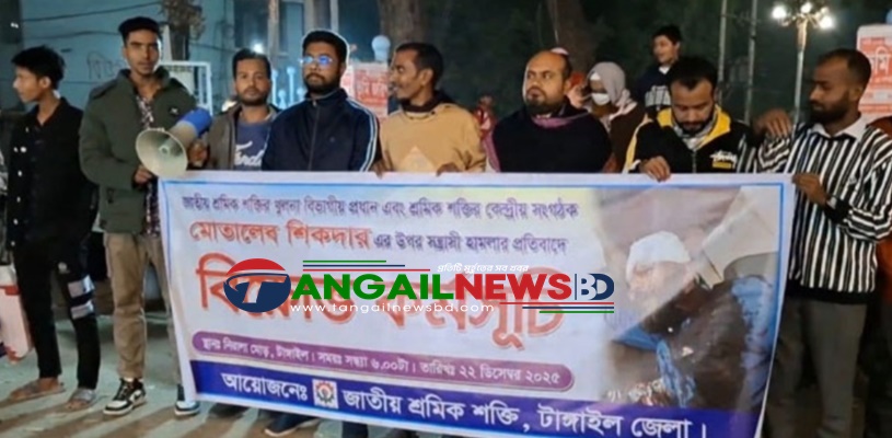 জাতীয় নাগরিক পার্টির (এনসিপি) খুলনা বিভাগীয় প্রধান ও শ্রমিক শক্তির কেন্দ্রীয় সংগঠক মোতালেব শিকদারকে গুলি করে গুরুতর আহত করার প্রতিবাদে টাঙ্গাইলে বিক্ষোভ কর্মসূচি পালিত হয়েছে। সোমবার (২২ ডিসেম্বর) সন্ধ্যায় টাঙ্গাইল জেলা শ্রমিক শক্তি এ কর্মসুচী পালন করে। শহরের কেন্দ্রীয় শহীদ মিনারের সামনে এ বিক্ষোভ কর্মসুচীতে এনসিপি, শ্রমিক শক্তি, যুব শক্তি, ছাত্র শক্তি সহ বিভিন্ন সংগঠনের নেতাকর্মীরা অংশ নেন।