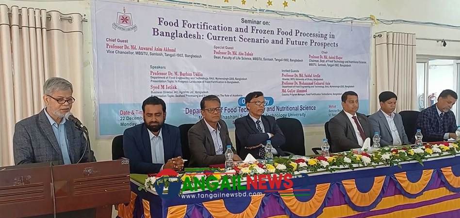 স্টাফ রিপোর্টার ॥ টাঙ্গাইলের মাওলানা ভাসানী বিজ্ঞান ও প্রযুক্তি বিশ্ববিদ্যালয়ে ফুড টেকনোলজি এন্ড নিউট্রিশনাল সায়েন্স বিভাগের আয়োজনে ‘ফুড ফর্টফিকেশন এন্ড ফ্রোজেন ফুড প্রসেসিং ইন বাংলাদেশ: কারেন্ট সিনারিও এন্ড ফিউচার প্রসপেক্টস’ শীর্ষক সেমিনার অনুষ্ঠিত হয়েছে। সোমবার (২২ ডিসেম্বর) সকাল ১০ টায় বিশ্ববিদ্যালয়ের ১২ তলা একাডেমিক ভবনের সেমিনার হলে অনুষ্ঠিত প্রধান অতিথি হিসেবে সেমিনারের উদ্বোধন করেন বিশ্ববিদ্যালয়ের ভাইস-চ্যান্সেলর প্রফেসর ড. মোঃ আনোয়ারুল আজীম আখন্দ।