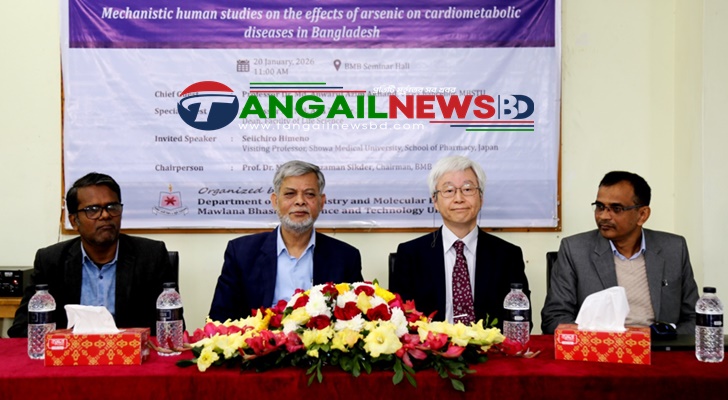 টাঙ্গাইল মাওলানা ভাসানী বিজ্ঞান ও প্রযুক্তি বিশ্ববিদ্যালয়ে বায়োকেমিস্ট্রি এন্ড মলিকুলার বায়োলজি বিভাগের আয়োজনে বাংলাদেশে আর্সেনিকজনিত স্বাস্থ্য ঝুঁকি বিষয়ক সেমিনার অনুষ্ঠিত হয়েছে। মঙ্গলবার (২০ জানুয়ারি) বেলা ১১ টায় বিভাগের সম্মেলন কক্ষে অনুষ্ঠিত “Mechanistic Human Studies on the Effects of Arsenic on Cardiometabolic Diseases in Bangladesh” শীর্ষক সেমিনারে প্রধান অতিথি হিসেবে বক্তব্য রাখেন বিশ্ববিদ্যালয়ের ভাইস-চ্যান্সেলর অধ্যাপক ড. আনোয়ারুল আজীম আখন্দ।