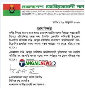 স্টাফ রিপোর্টার ॥ টাঙ্গাইল-৪ (কালিহাতী) আসনের স্বতন্ত্র প্রার্থী কালিহাতী উপজেলা বিএনপি’র উপদেষ্টা ও জাতীয়তাবাদী মুক্তিযোদ্ধা দল কেন্দ্রীয় কমিটির সহ-সভাপতি বীর মুক্তিযোদ্ধা ইঞ্জিনিয়ার আব্দুল হালিমকে বিএনপির সকল পদ থেকে বহিষ্কার করা হয়েছে। সোমবার (২৬ জানুয়ারী) বাংলাদেশ জাতীয়তাবাদী দল বিএনপির সিনিয়র যুগ্ম মহাসচিব এ্যাডভোকেট রুহুল কবির রিজভী সাক্ষরিত প্রেস বিজ্ঞপ্তিতে ইঞ্জিনিয়ার আব্দুল হালিমকে দল থেকে বহিষ্কার করার কথা জানানো হয়েছে।