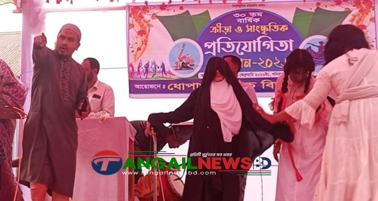 টাঙ্গাইলের ধনবাড়ীতে ধোপাখালী উচ্চ বিদ্যালয়ের ৩০তম বার্ষিক ক্রীড়া ও সাংস্কৃতিক অনুষ্ঠানে বাঁধা প্রদানের অভিযোগ উঠেছে স্থানীয় এক জামায়াত নেতার বিরুদ্ধে। অভিযুক্ত আতিকুর রহমান উপজেলার ধোপাখালী ইউনিয়নের ২নং ওয়ার্ড জামায়াতে ইসলামীর সেক্রেটারি বলে জানা গেছে। অনুষ্ঠান চলাকালীন সময়ে মঞ্চে উঠে উপস্থাপকের হাত থেকে মাইক্রোফোন কেড়ে নিয়ে অকথ্য ভাষায় গালিগালাজ এবং অনুষ্ঠান বন্ধের হুমকি দেয়। এ ঘটনায় বিদ্যালয়ের শিক্ষক, কোমলমতি শিক্ষার্থী ও অভিভাবকদের মধ্যে তীব্র ক্ষোভের সৃষ্টি হয়েছে।