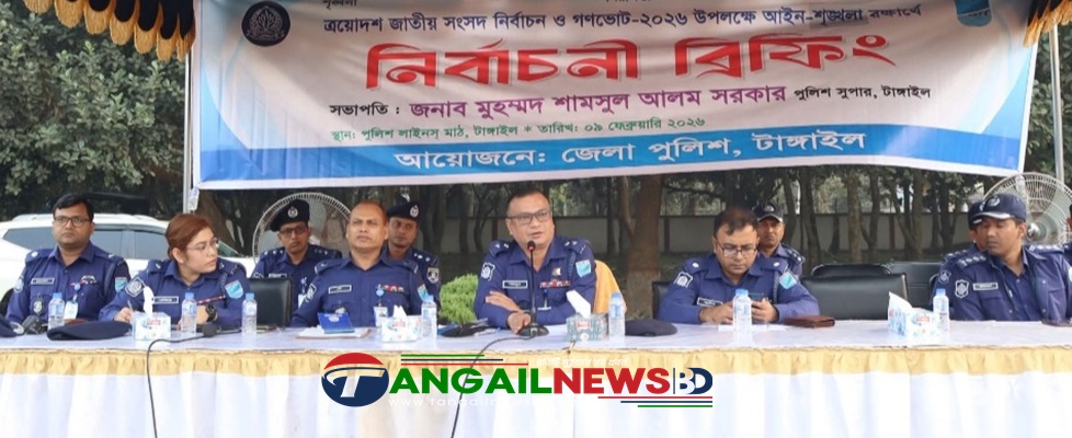 ত্রয়োদশ জাতীয় সংসদ নির্বাচন ও গণভোট-২০২৬ উপলক্ষে নির্বাচন ডিউটিতে নিয়োজিত সকল পুলিশ অফিসার ও ফোর্সদের নিয়ে একটি নির্বাচনী ব্রিফিং অনুষ্ঠিত হয়েছে। সোমবার (৯ ফেব্রুয়ারী) টাঙ্গাইল জেলা পুলিশ বিভাগের আয়োজনে পুলিশ লাইন্স মাঠে এ ব্রিফিং অনুষ্ঠিত হয়। উক্ত ব্রিফিংয়ে সভাপতিত্ব করেন পুলিশ সুপার মুহম্মদ শামসুল আলম সরকার। ব্রিফিংয়ে পুলিশ সুপার নির্বাচনী দায়িত্ব পালনের ক্ষেত্রে প্রয়োজনীয় নিদের্শনা প্রদান করেন এবং ডিউটিতে নিয়োজিত অফিসার ও ফোর্সদের দায়িত্ব ও কর্তব্য সম্পর্কে বিস্তারিতভাবে অবহিত করেন।