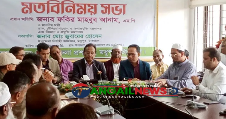 মতবিনিময় সভায় মধুপুর উপজেলা নির্বাহী কর্মকর্তা জুবায়ের হোসেনের সভাপতিত্বে অনুষ্ঠিত হয়। এ সময় মধুপুর উপজেলা সহকারী কমিশনার (ভূমি) নঈম উদ্দিন আহমদ, মধুপুর উপজেলা বিএনপির সভাপতি জাকির হোসেন সরকার, মধুপুর থানার (ওসি) জাফর ইকবাল প্রমুখ উপস্থিত ছিলেন।
